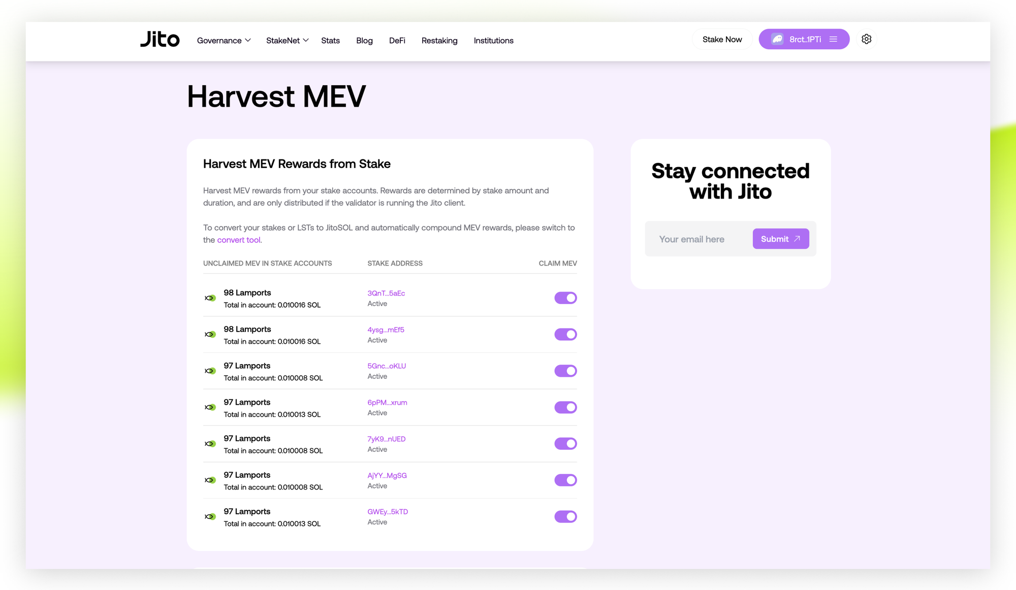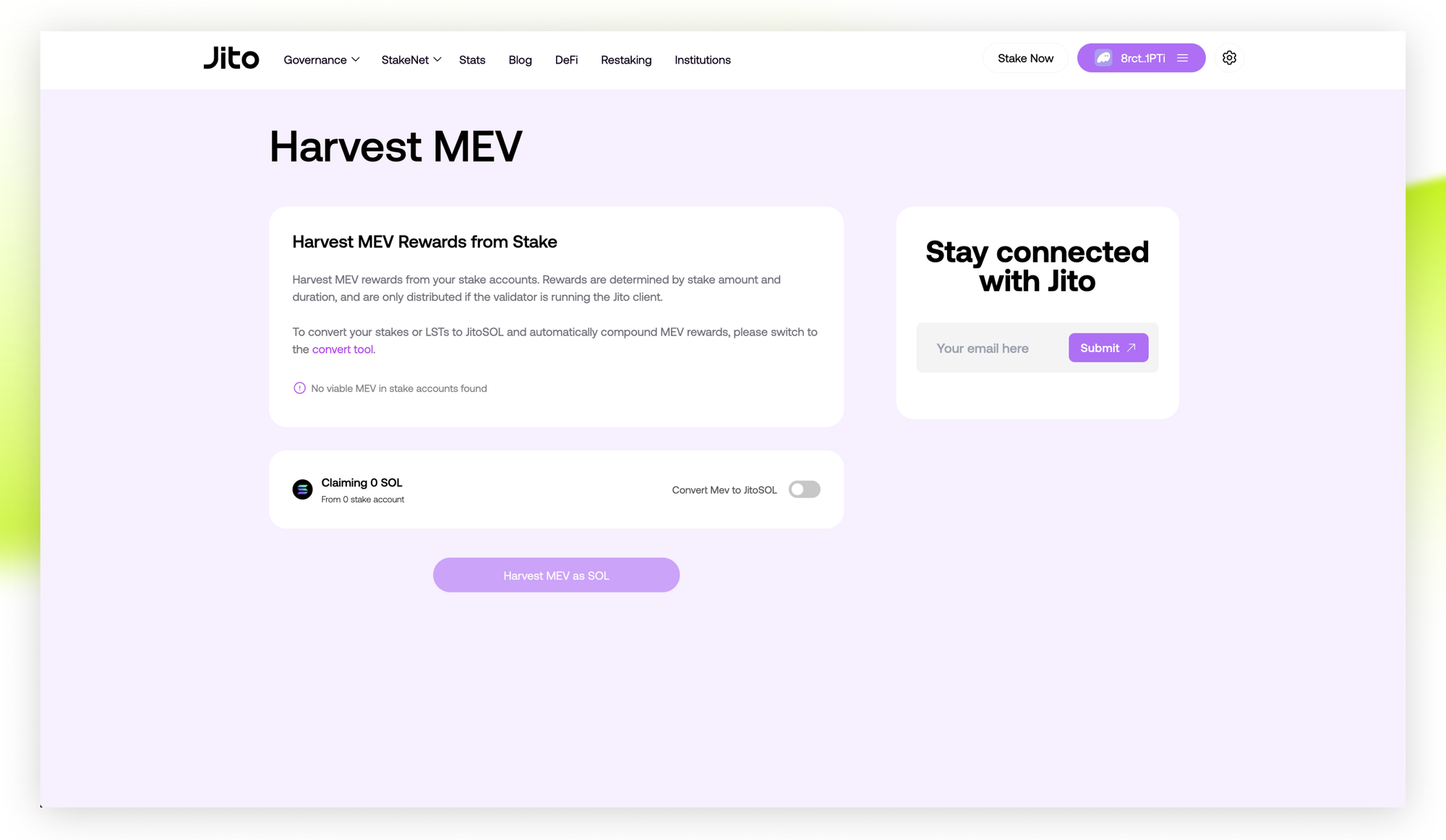 To harvest your MEV rewards: Visit the Jito Harvest UI to claim and restake your accumulated MEV rewards. https://www.jito.network/harvest/