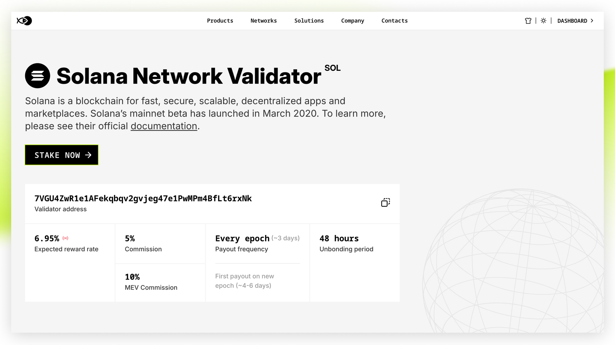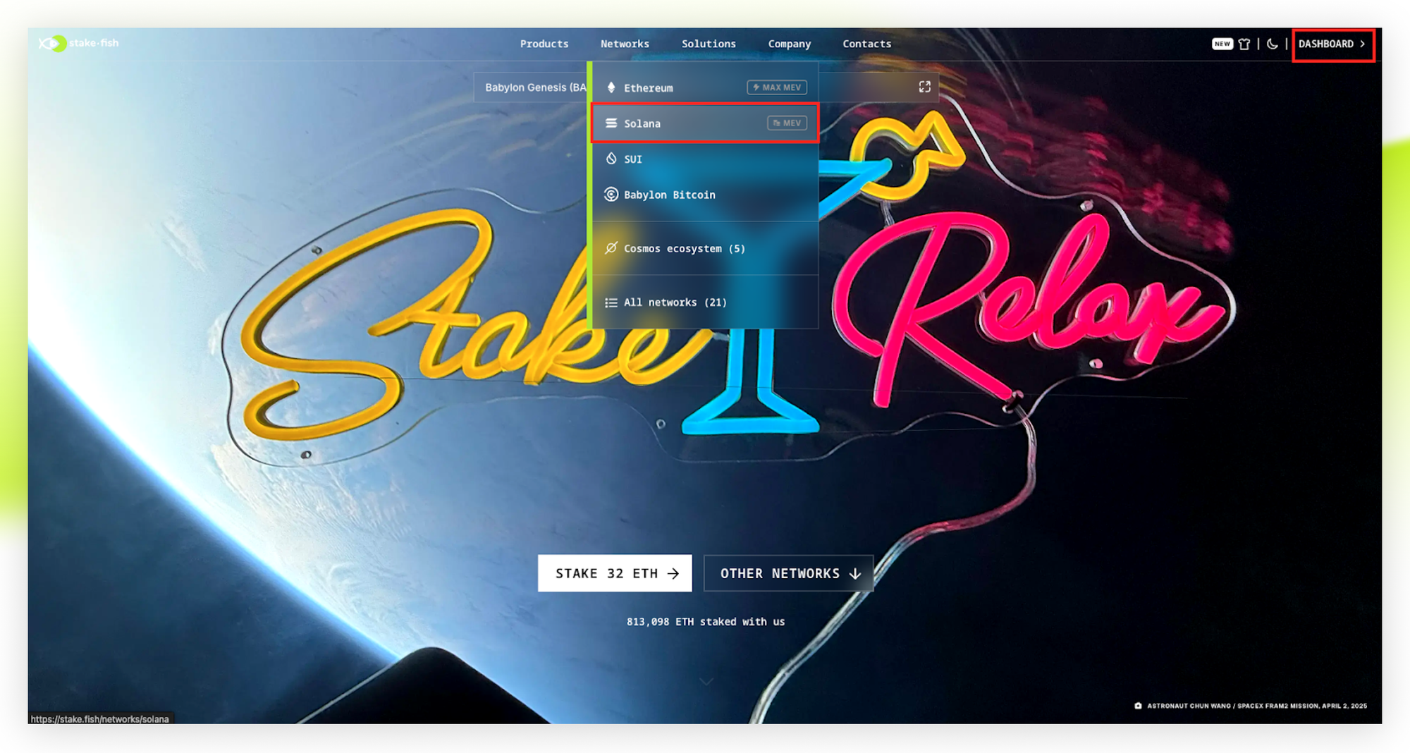 1. Open the stakefish Solana staking dashboard by selecting “dashboard” from the homepage or selecting “Solana” from the “Networks” dropdown menu.
