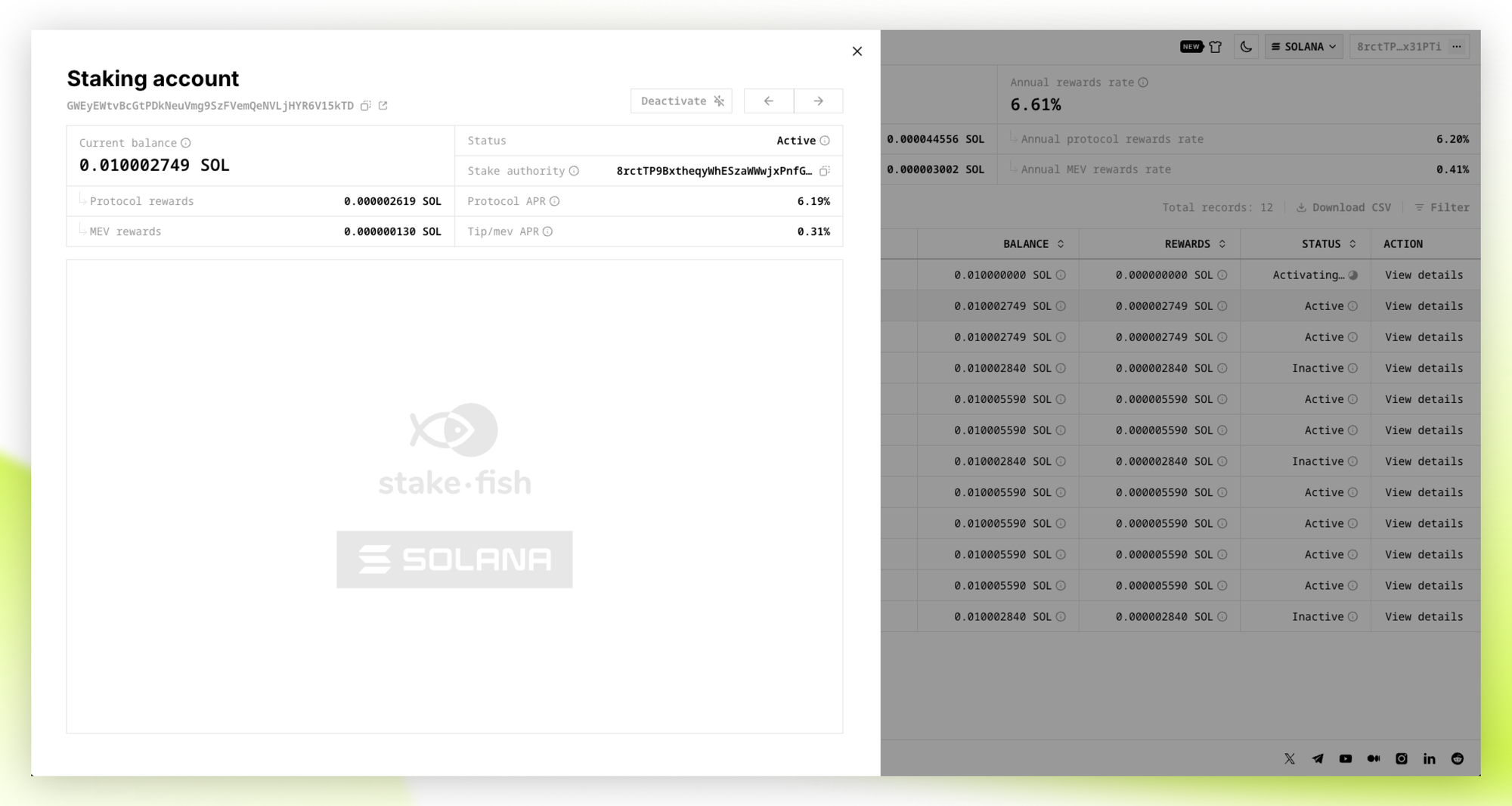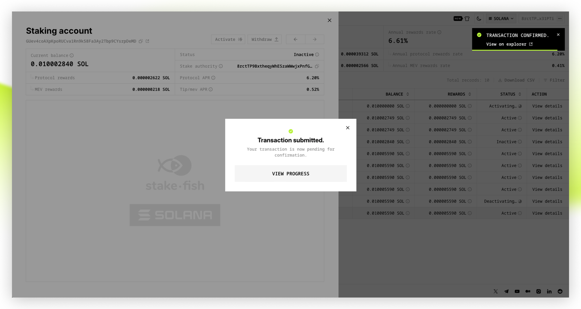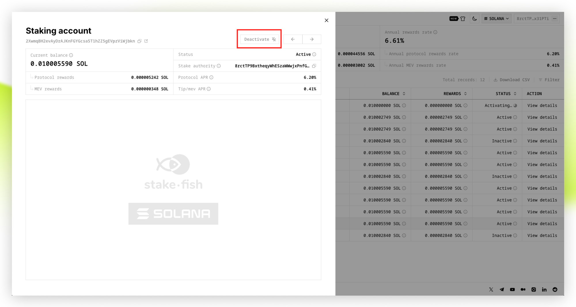 - Once your stake is activated and the status changes to “Active”, your Solana stake will start generating staking rewards. You can also find the stake account in the Stake Account list, click “View details”, select “Stake authority”, and check the status of the Staking account corresponding to this “Stake authority” on solscan.io.