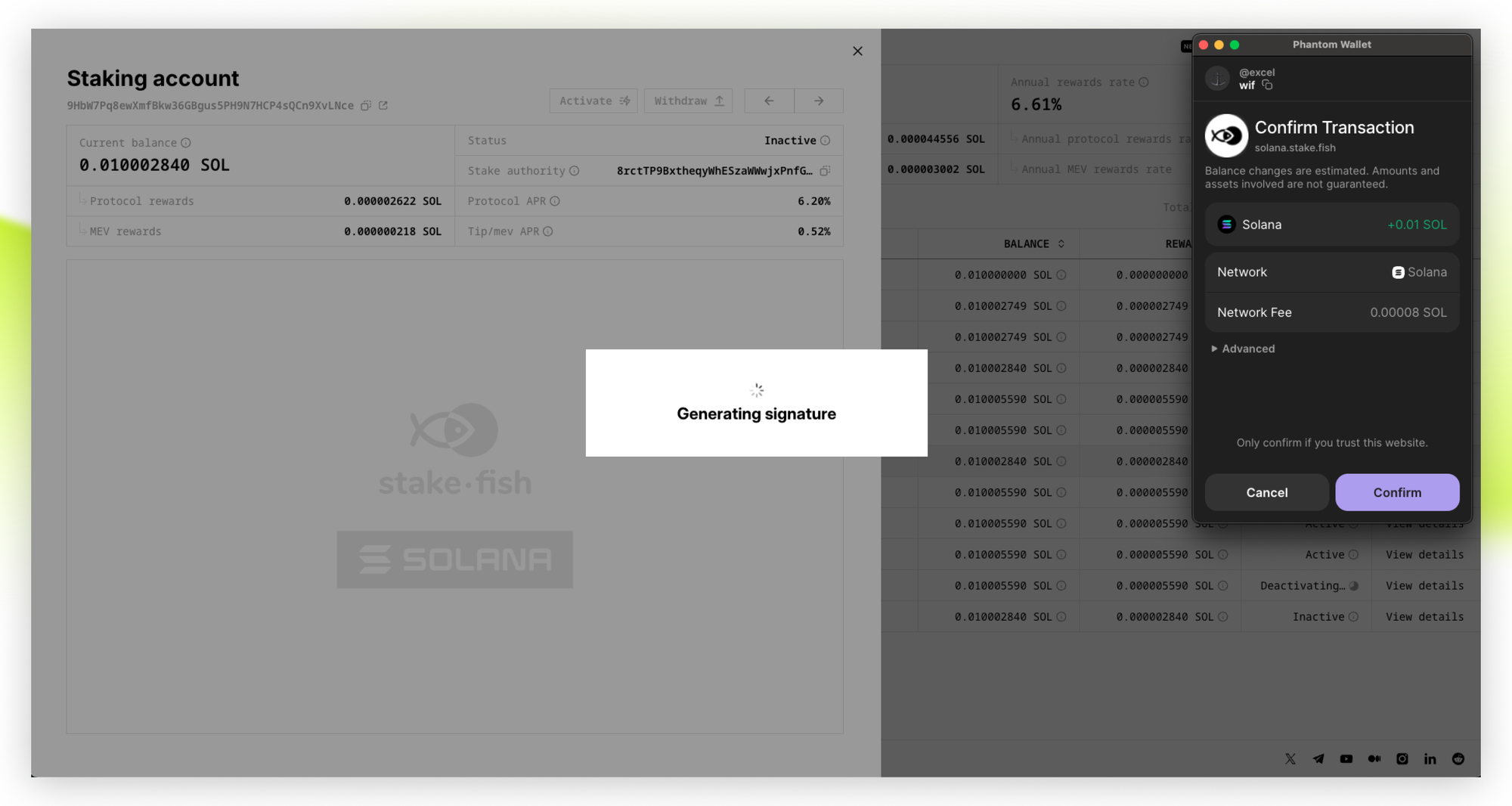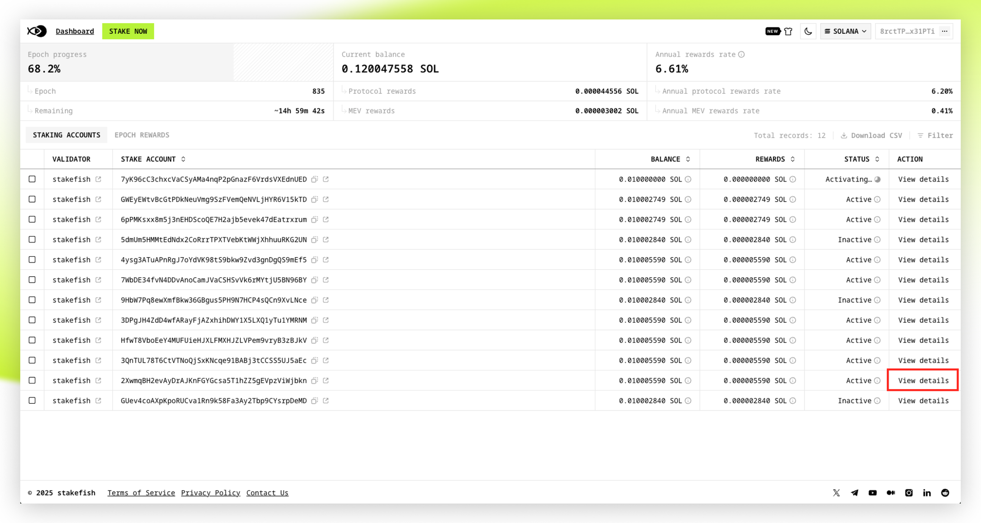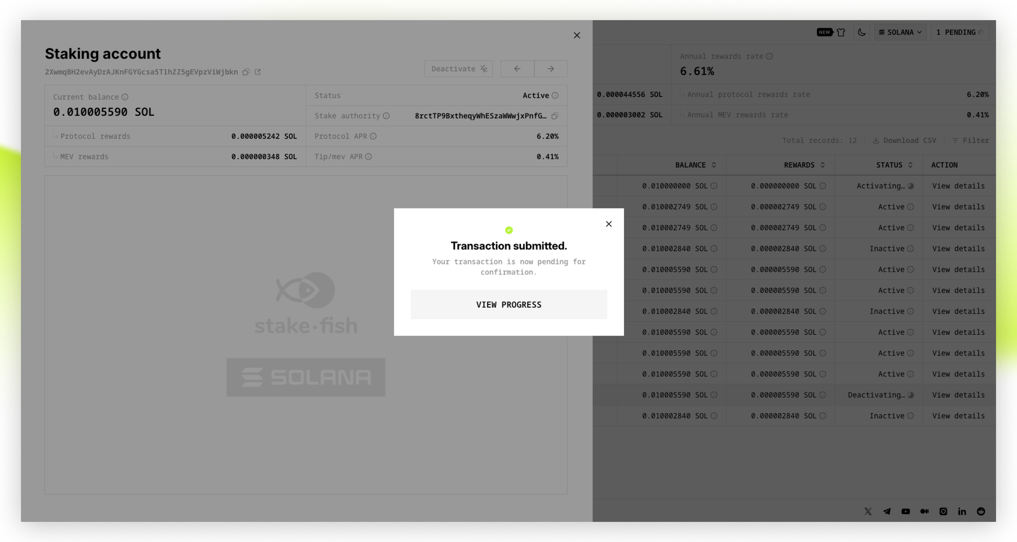- Once your stake is activated and the status changes to “Active”, your Solana stake will start generating staking rewards. You can also find the stake account in the Stake Account list, click “View details”, select “Stake authority”, and check the status of the Staking account corresponding to this “Stake authority” on solscan.io.