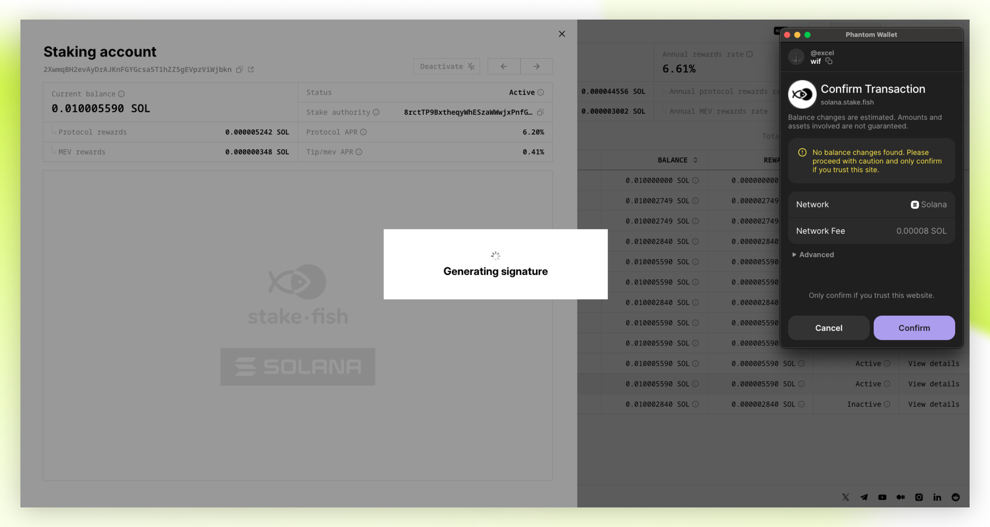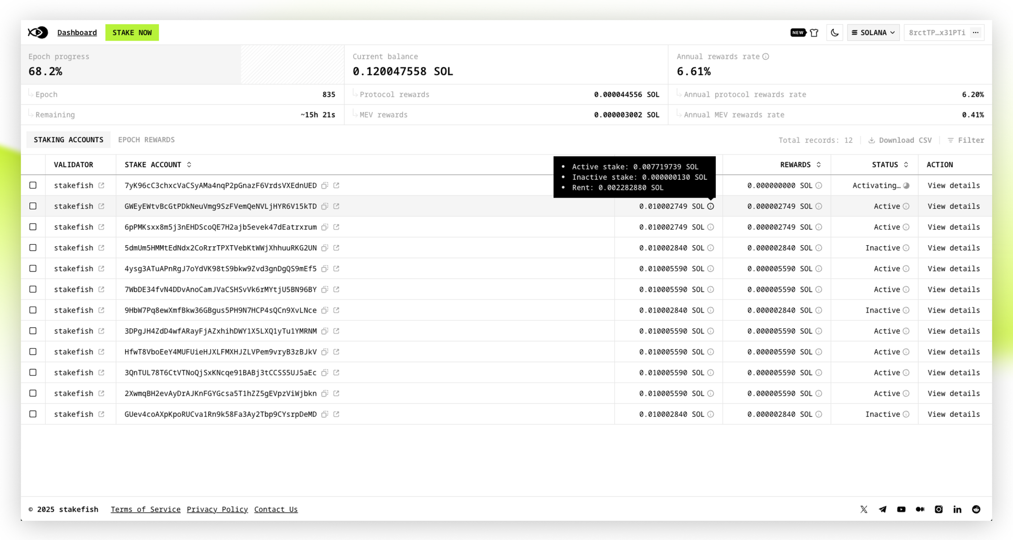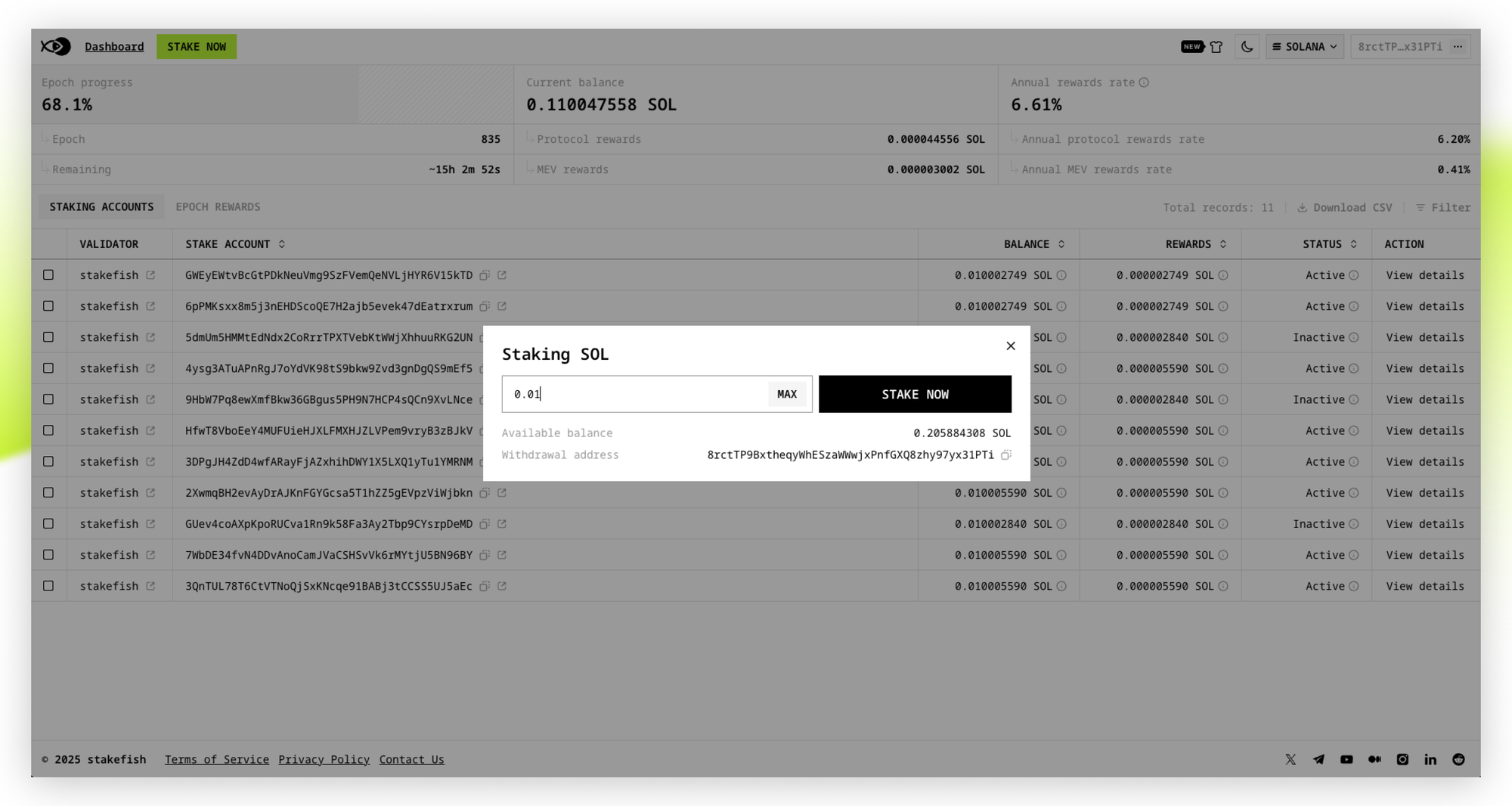 Our Solana Staking Dashboard brings the same beloved stakefish Ethereum staking experience to Solana, now with features tailored for serious stakers and institutions. This is the most complete Solana staking dashboard in the industry, giving you one unified view to manage all your Solana stake accounts, track MEV rewards history, and see real-time staking and rewards.