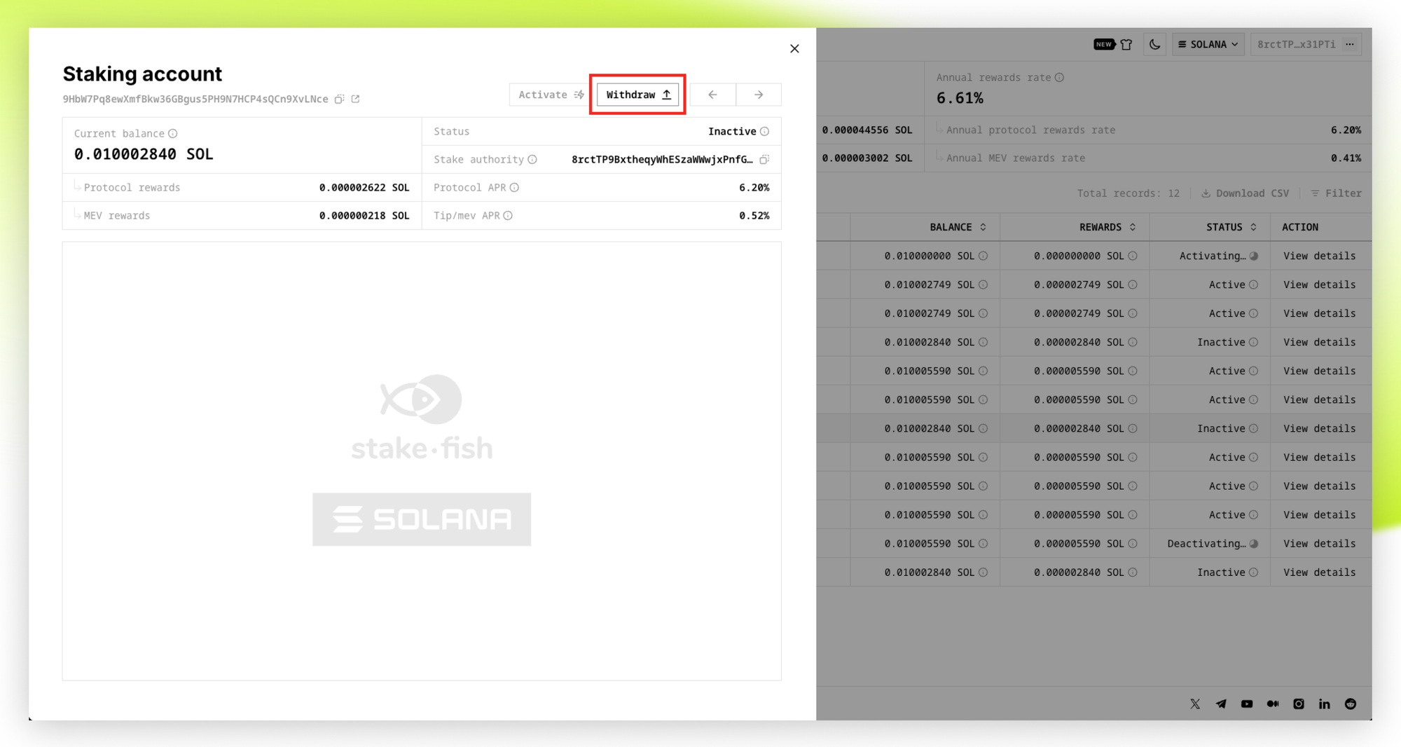 - Once Inactive, click Withdraw on the stake account.