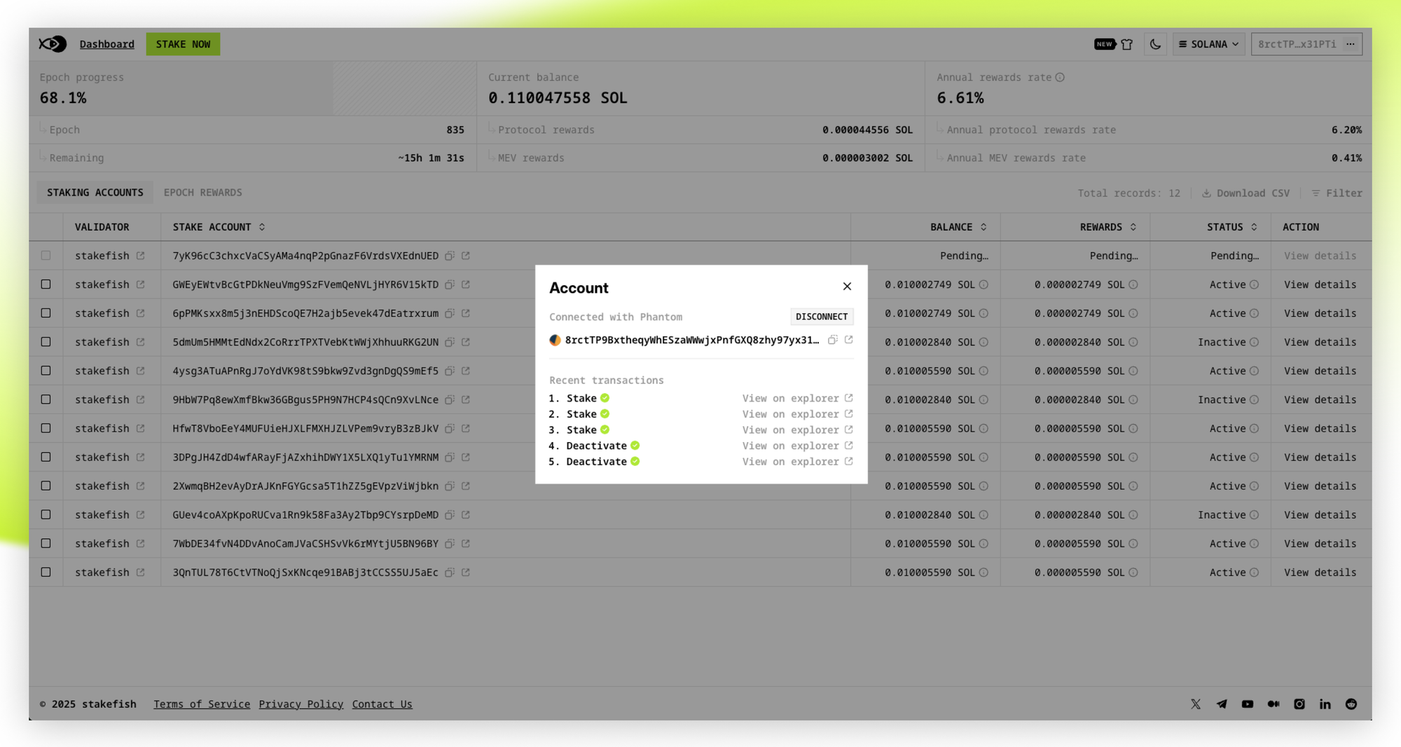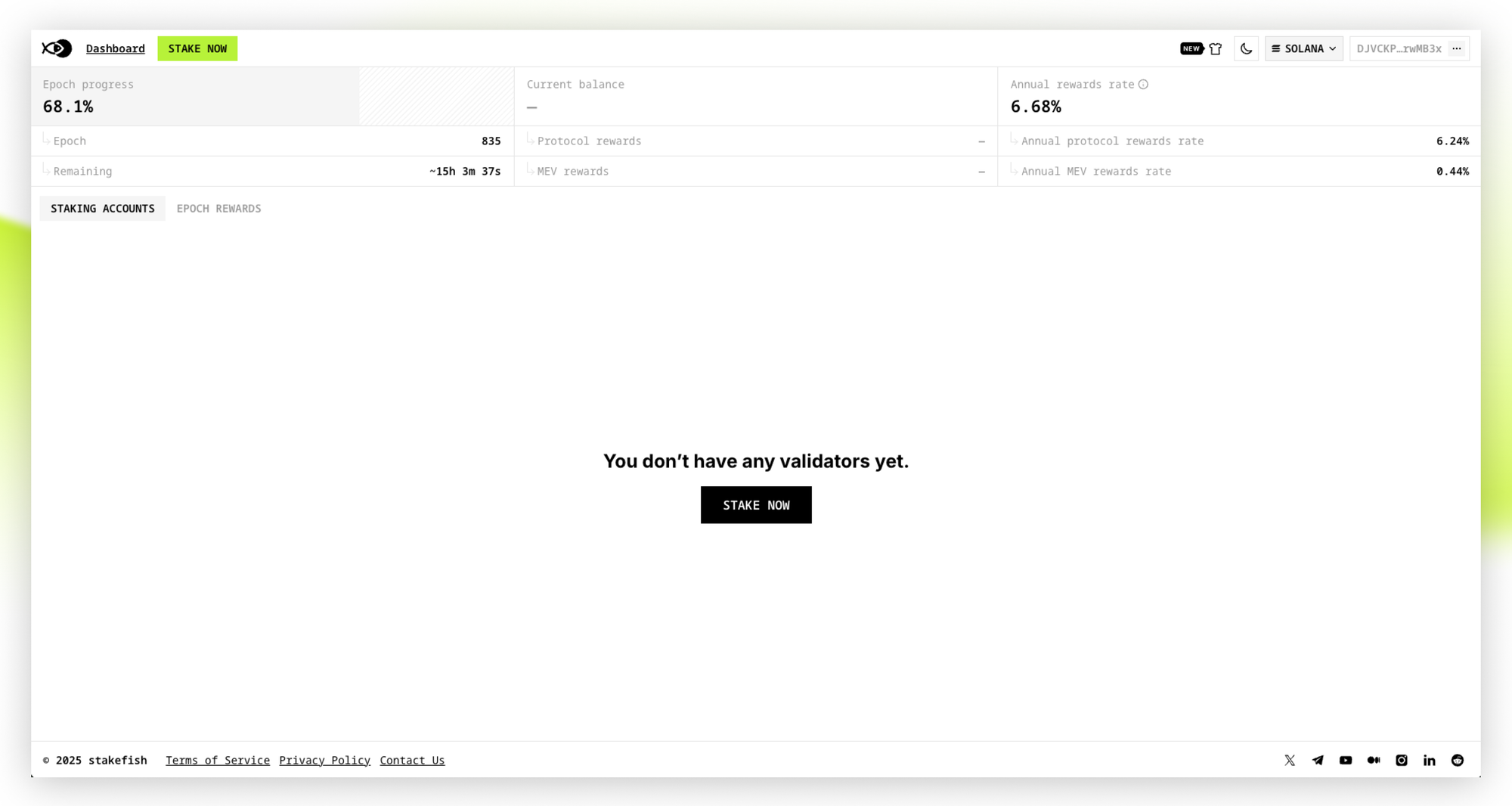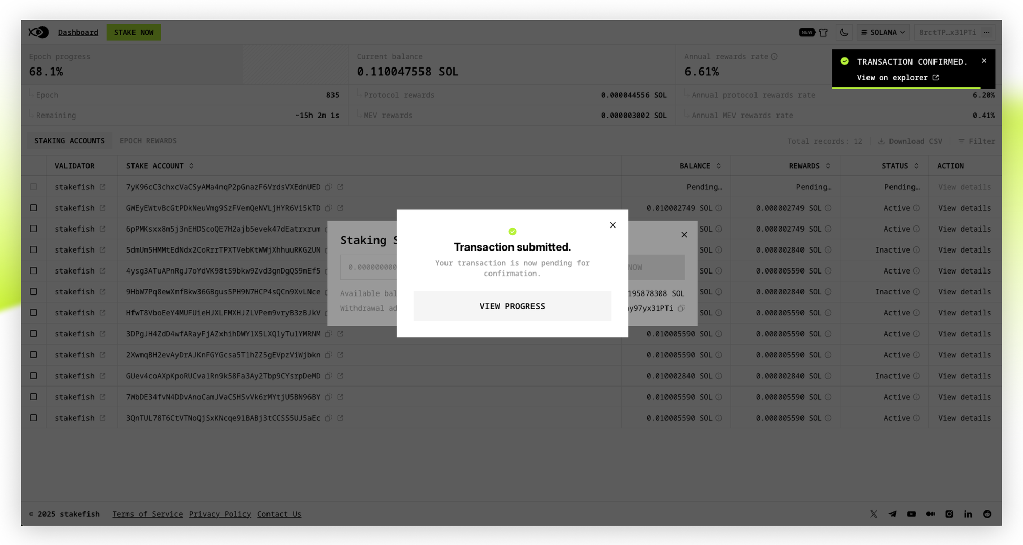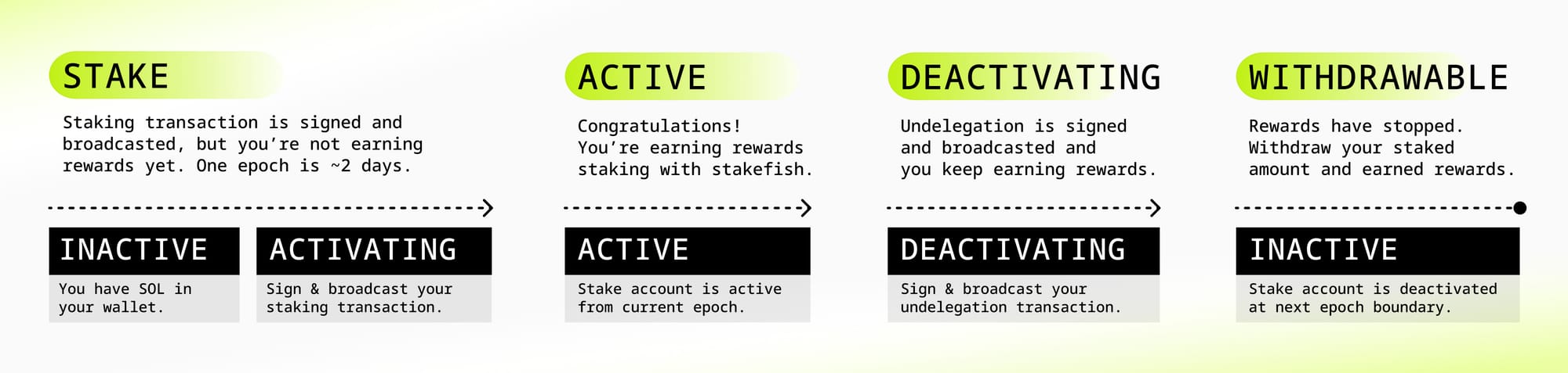 Understanding this lifecycle helps you plan your staking strategy, especially if you need access to your SOL by a specific date. The stakefish dashboard shows your current status in real-time, so you always know exactly where your stake is in this journey.