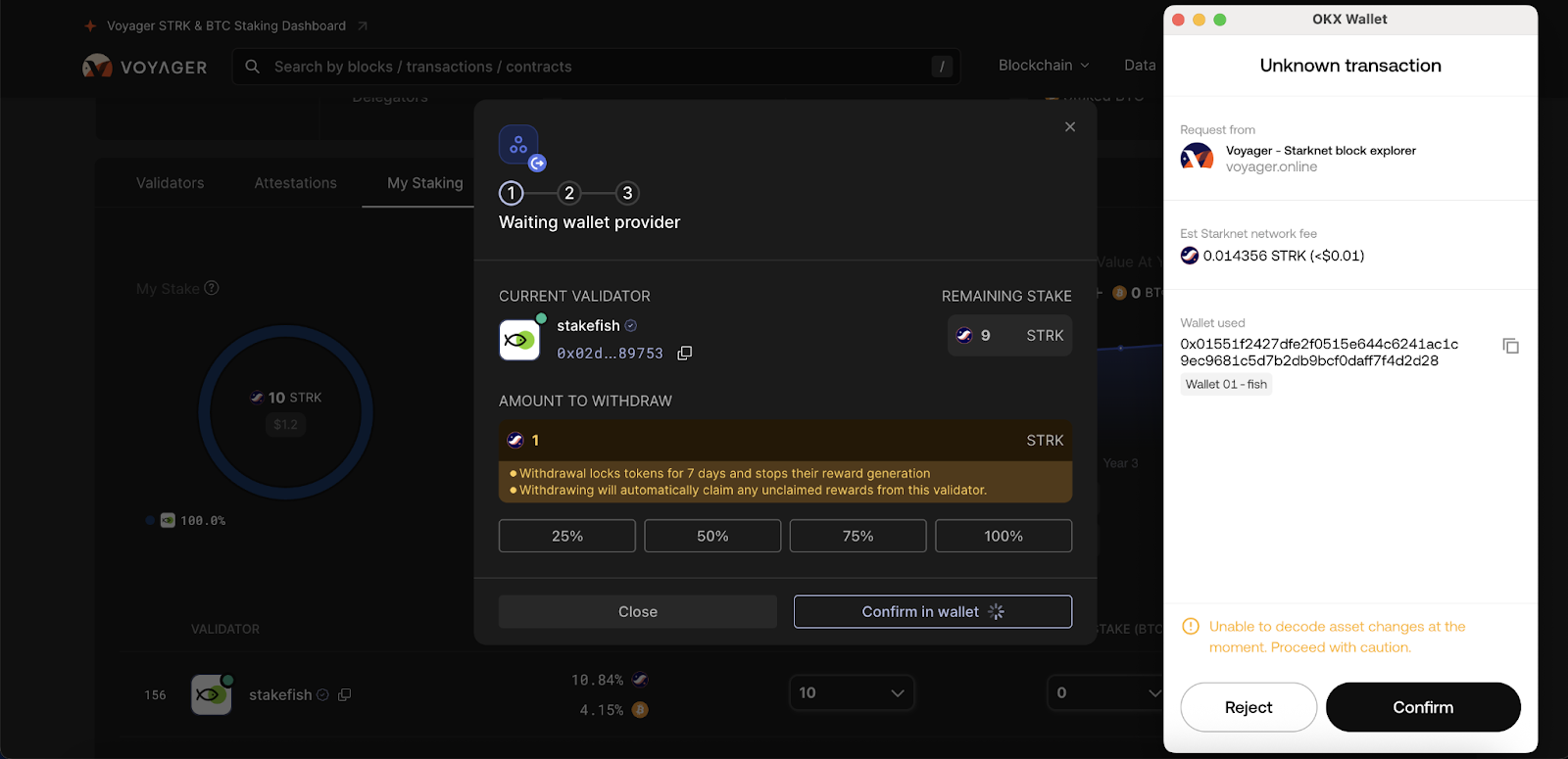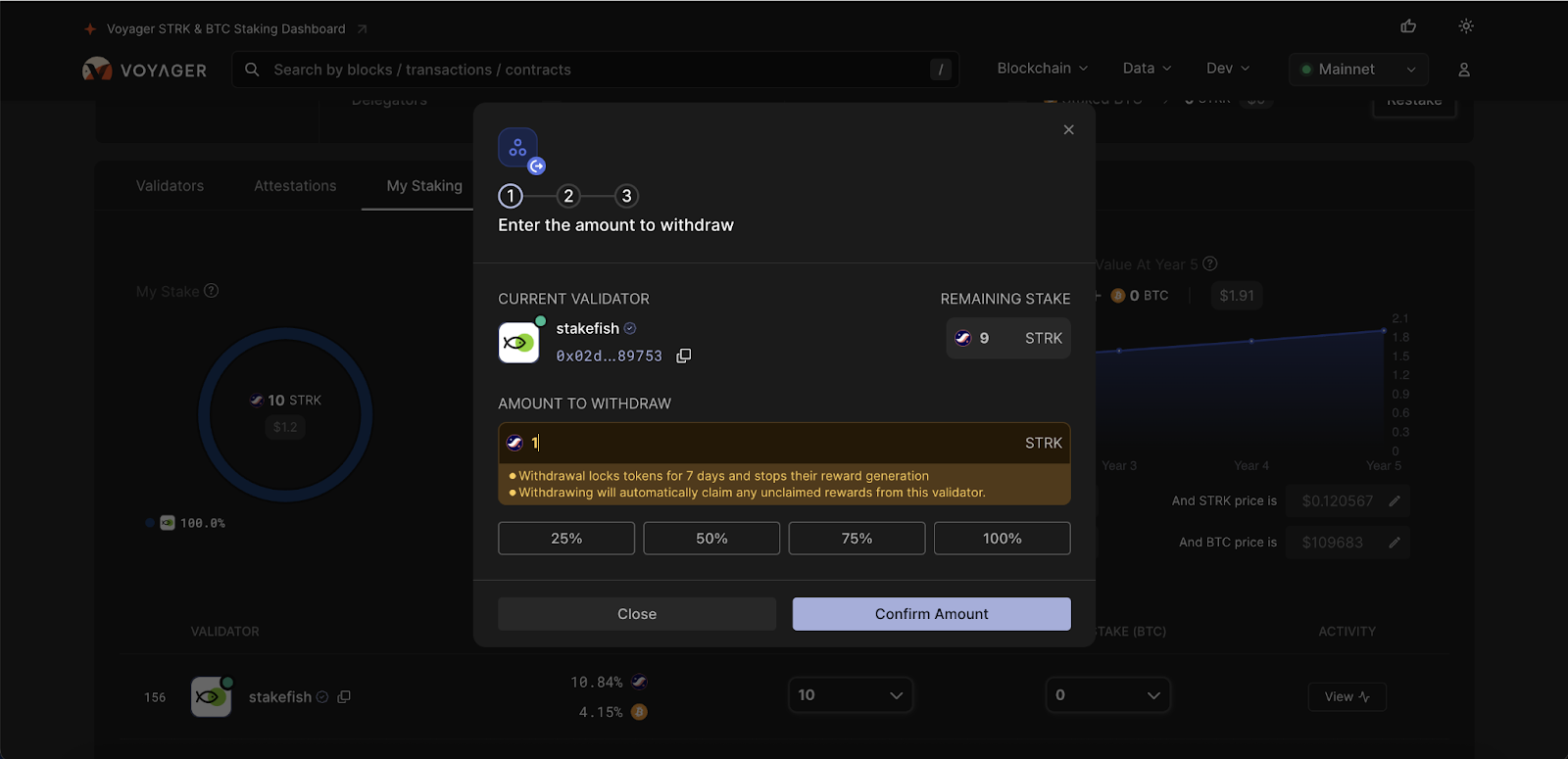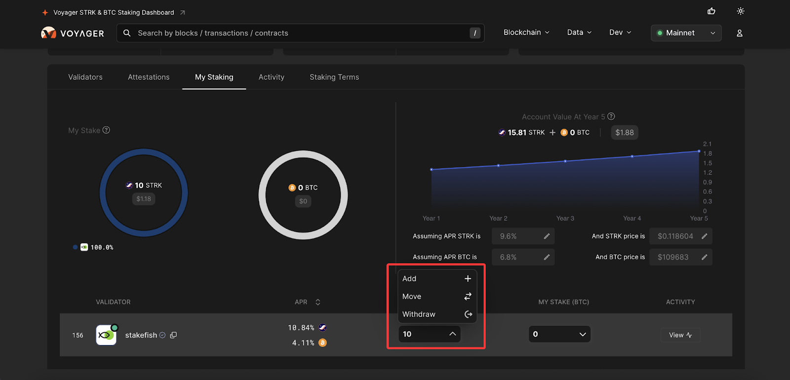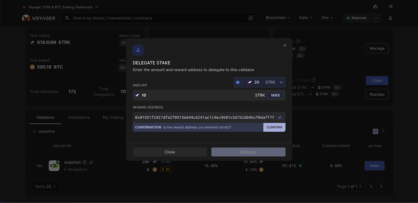 Note: A small amount of STRK is required for gas fees for token transactions and transaction confirmations. Assets must be on Starknet to be staked.