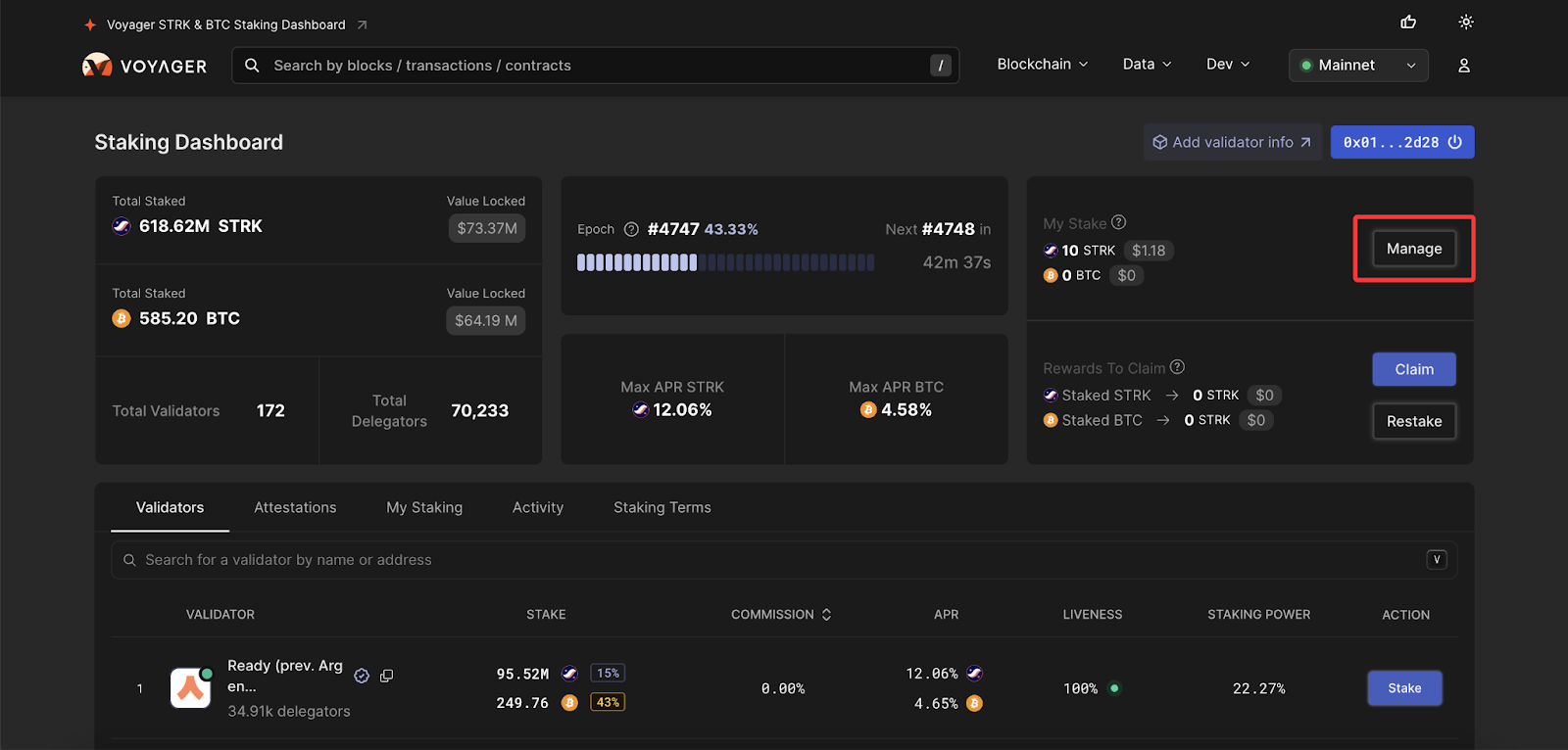 1. Go to the “Staking Dashboard”. Click “Manage”.