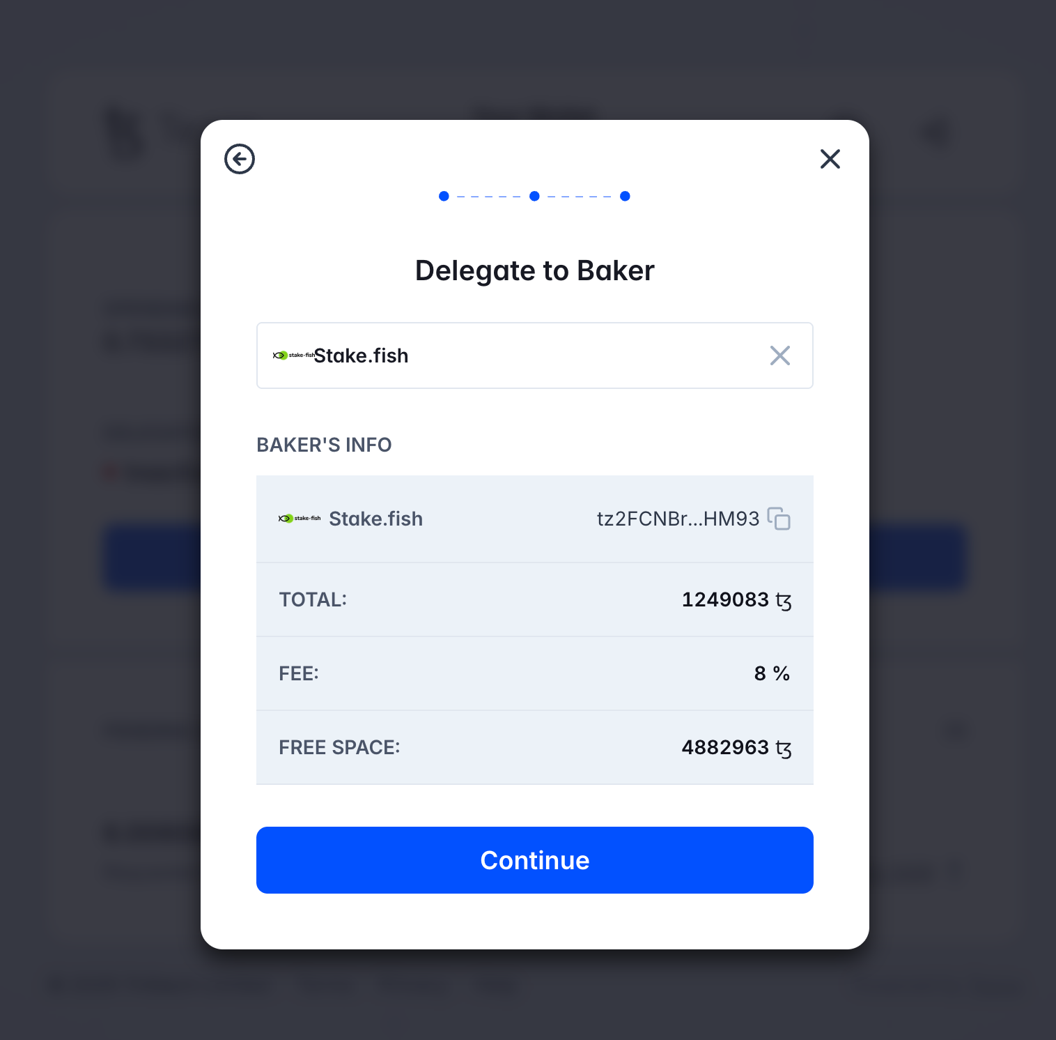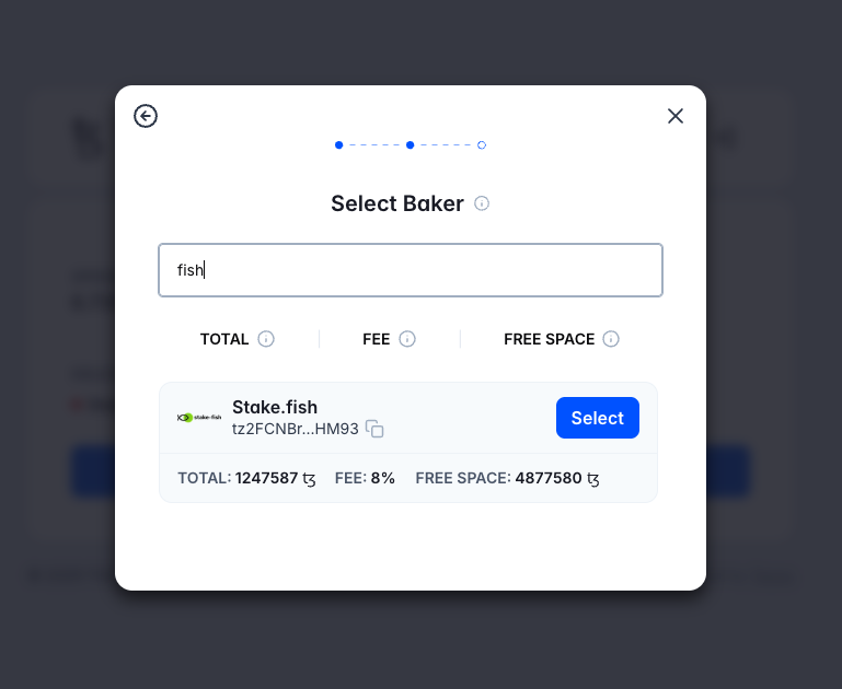 Click Select Baker and choose your validator. Search for stakefish and click Select.