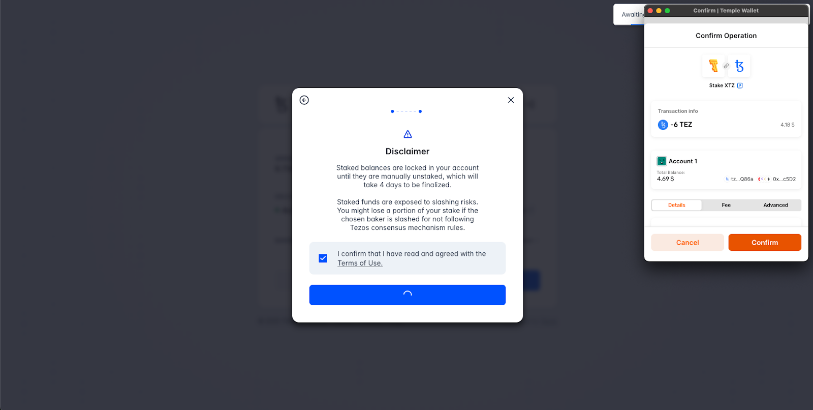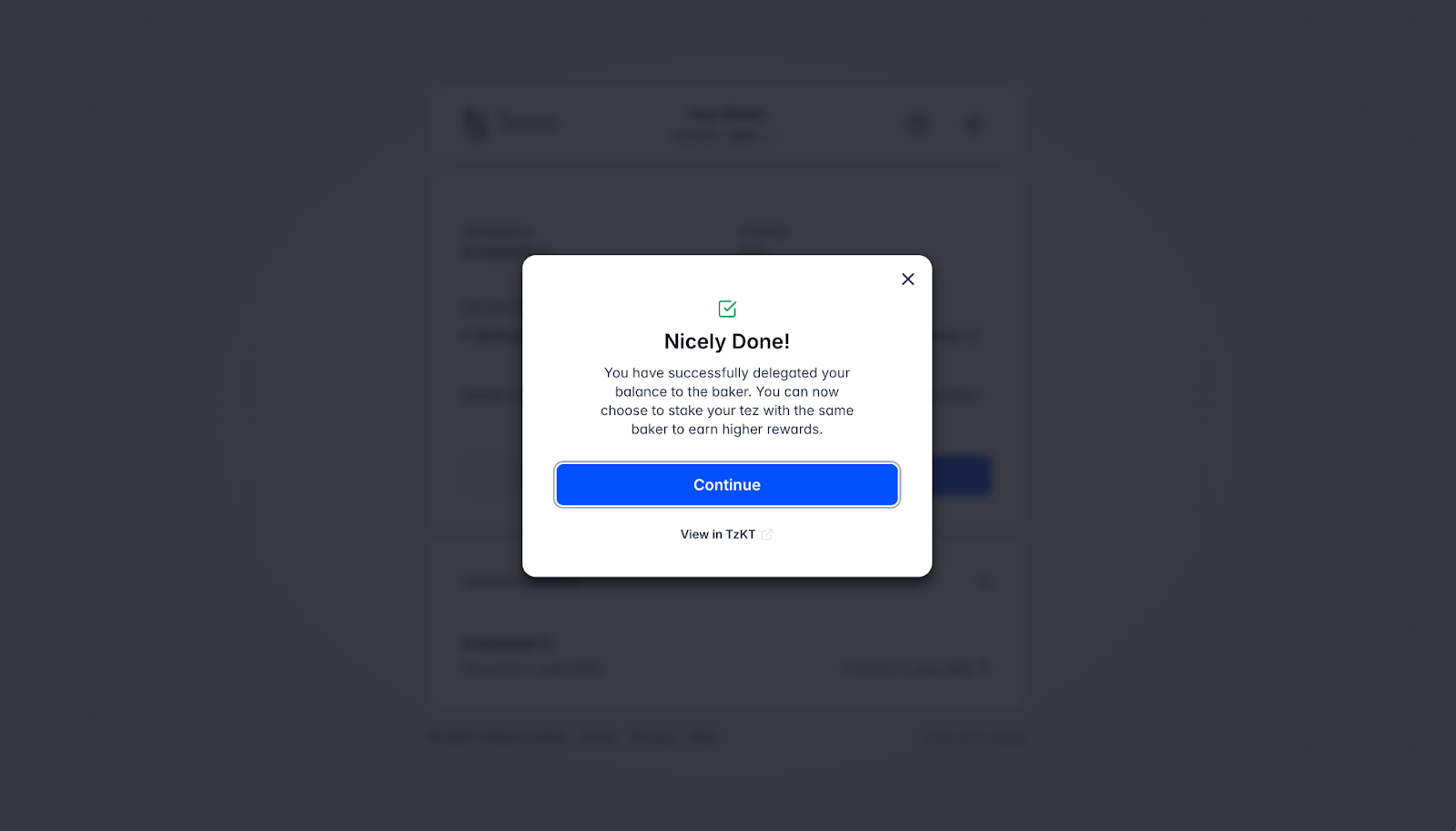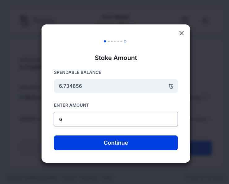 Enter the amount of XTZ you want to stake. Click Continue and approve the transaction in your wallet.
