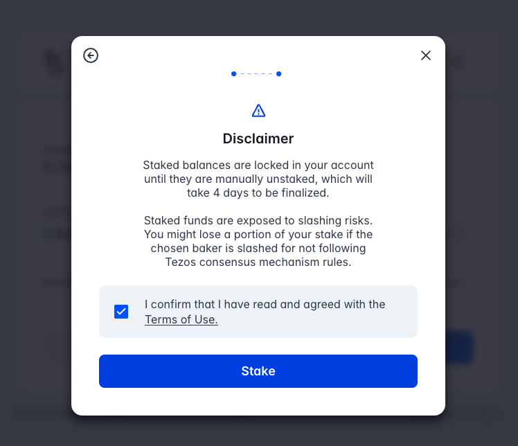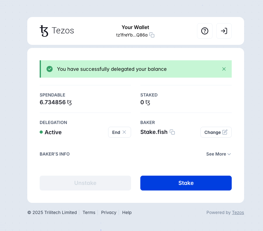 You must delegate your balance to a baker before you can stake. This guide will walk through delegation first, then staking with stakefish.