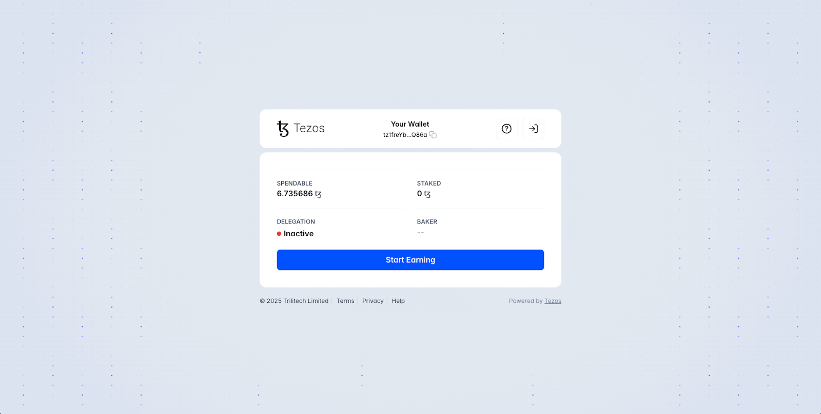 Once connected, your balance and current delegation status will appear. If no funds are delegated yet, the status will show Inactive. Click Start Earning.