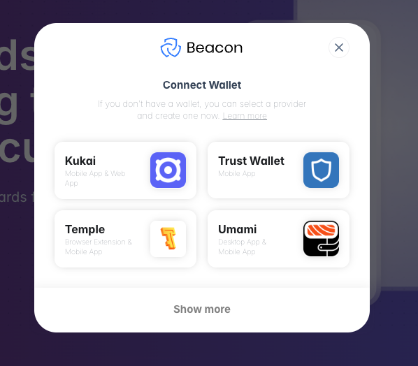 Choose your wallet (Kukai, Temple, Umami, or via WalletConnect). Approve the connection request.