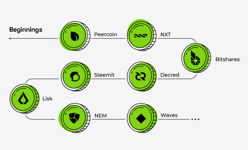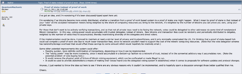 While the rise to prominence of Proof of Stake networks is relatively recent, the idea isn’t. The first public mention of the idea was back in 2011, when Bitcoin was just two years old. Among other suggested improvements, BitcoinTalk user QuantumMechanic presented the idea as a way to lower transaction fees and speed up transaction confirmation, and even introduced the idea of delegation.